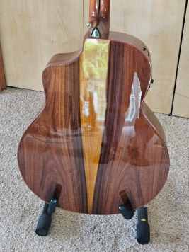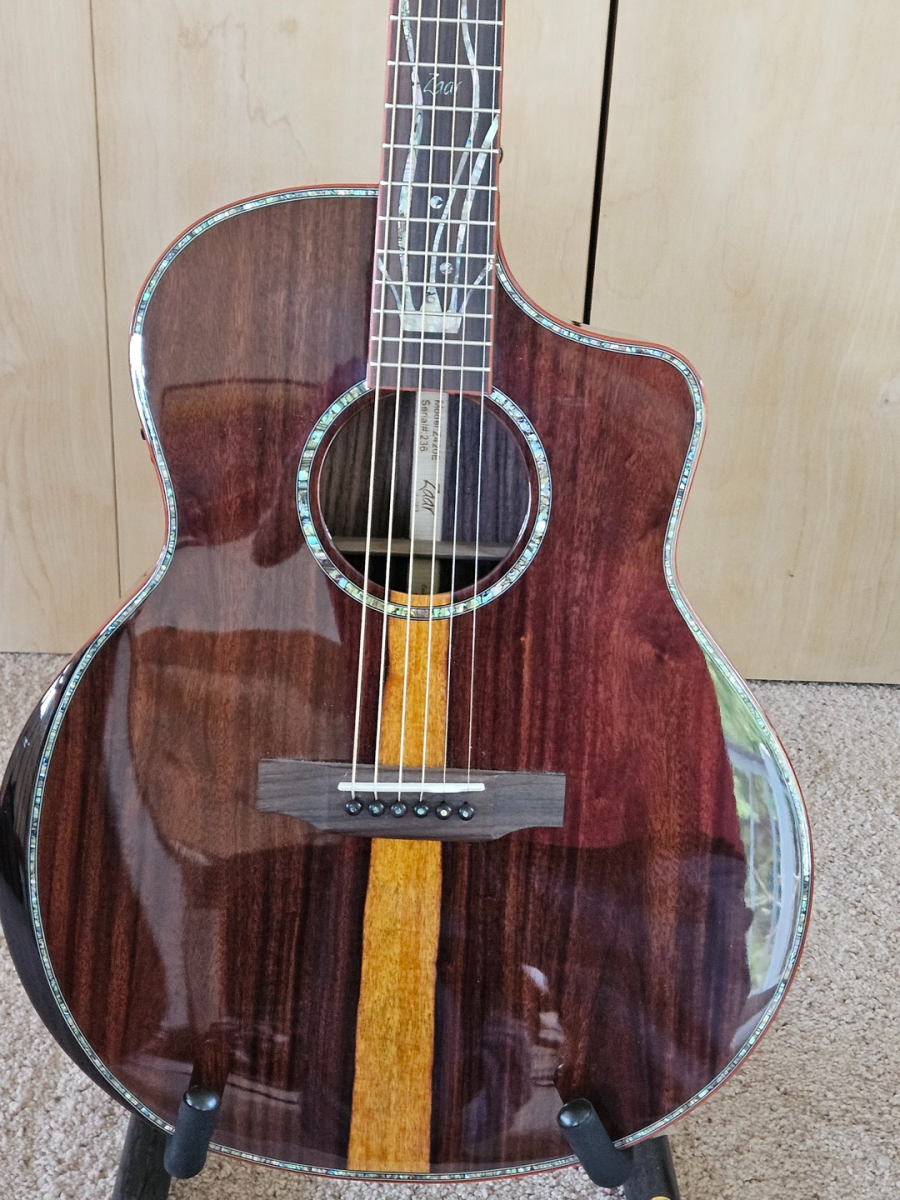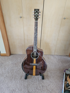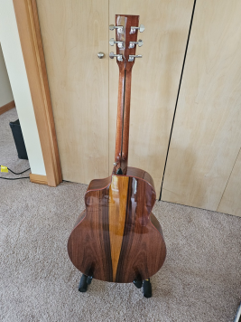 This beautiful guitar came to me as a factory repaired unit and a quick exam revealed a cracked headstock. It was repaired nicely, but the nut and saddle were so aggressively sanded down that the top E and B strings were grounded out on the frets. Nothing else to do but straighten the neck and replace the nut and saddle with new Tusq pieces and do a complete setup. Plays great and sounds wonderful too.